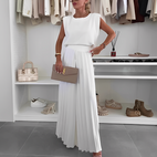 Mukavuus ja tyyli yhdessä setissä: Adèlese-setti koostuu hihattomasta V-kaula-aukkoisesta paidasta ja leveälahkeisista housuista, jotka on suunniteltu naisille, jotka etsivät sekä tyyliä että mukavuutta. Valmistettu kevyestä ja ilmavasta kankaasta, se takaa pehmeyden ja hengittävyyden tunteen koko päivän ajan. Sen minimalistinen muotoilu mahdollistaa monia yhdistelmiä, täydellisiä työhön, rentoihin tilaisuuksiin tai erityisiin hetkiin. Joustovyötäröiset housut tarjoavat imartelevan siluetin säilyttäen mukavuuden. Adèlesen avulla saat tyylikkään ja täydellisen asun, joka kohottaa vaatekaappiasi vaivattomasti.