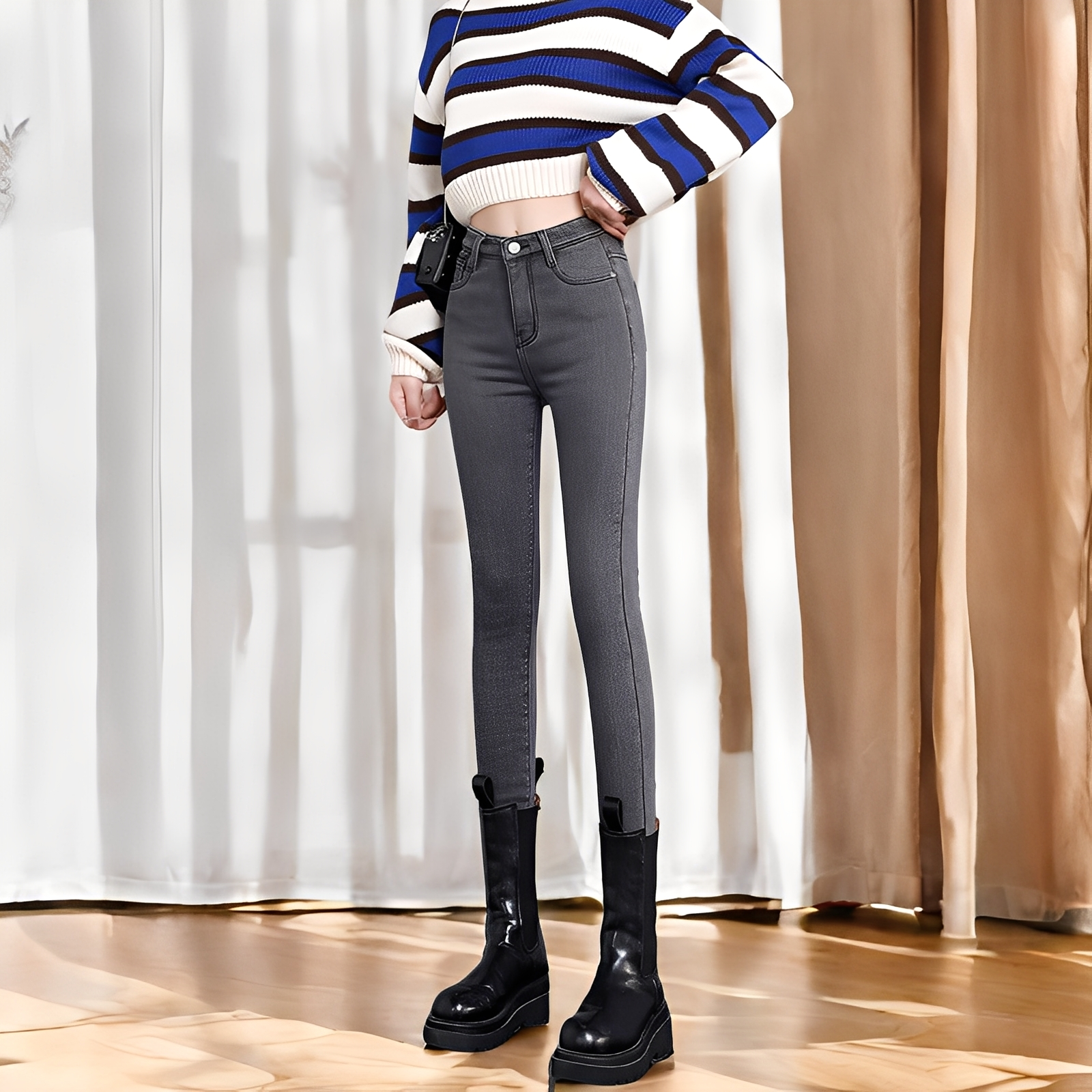 Nämä thermo-skinnyfarkut tarjoavat täydellisen yhdistelmän tyylikästä istuvuutta ja kodikasta lämpöä. Pehmeä, fleecevuorattu sisäosa pitää luotettavasti lämpimänä, kun taas joustava materiaali mukautuu miellyttävästi jokaiseen liikkeeseen. Moderni, vartaloa korostava siluetti varmistaa, että näytät itsevarmalta ja muodikkaalta myös kylminä päivinä. Ihanteellinen arkeen, kävelyille tai työmatkalle.