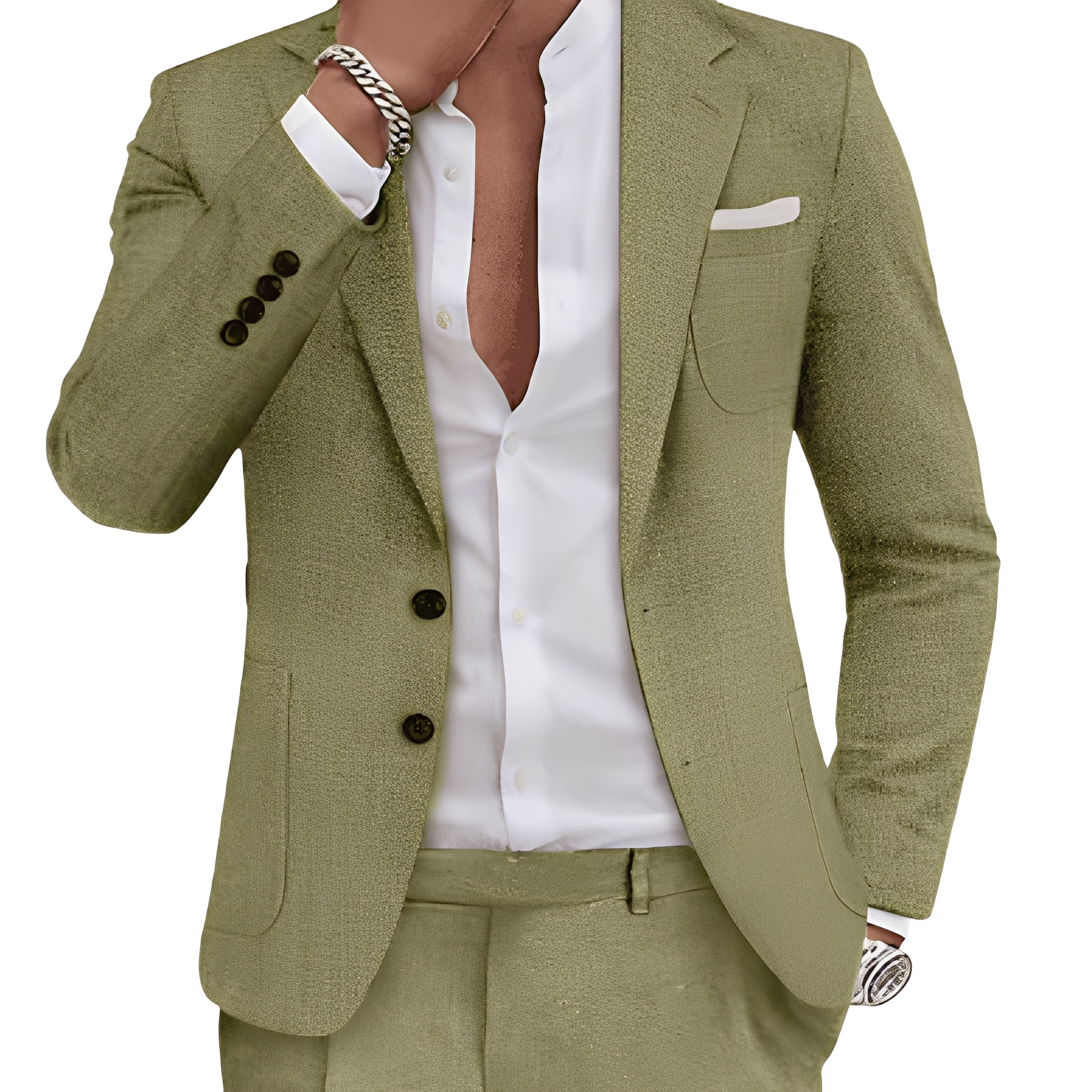 Clinton-puku yhdistää klassisen tyylin moderniin rentouteen. Kevyestä pellavasekoitteesta valmistettu puku tarjoaa miellyttävän käyttömukavuuden – täydellinen lämpimiin päiviin tai erityisiin tilaisuuksiin. Sen tyylikäs muotoilu käytännöllisine taskuineen tekee siitä todellisen katseenvangitsijan niin toimistossa kuin vapaa-ajalla.