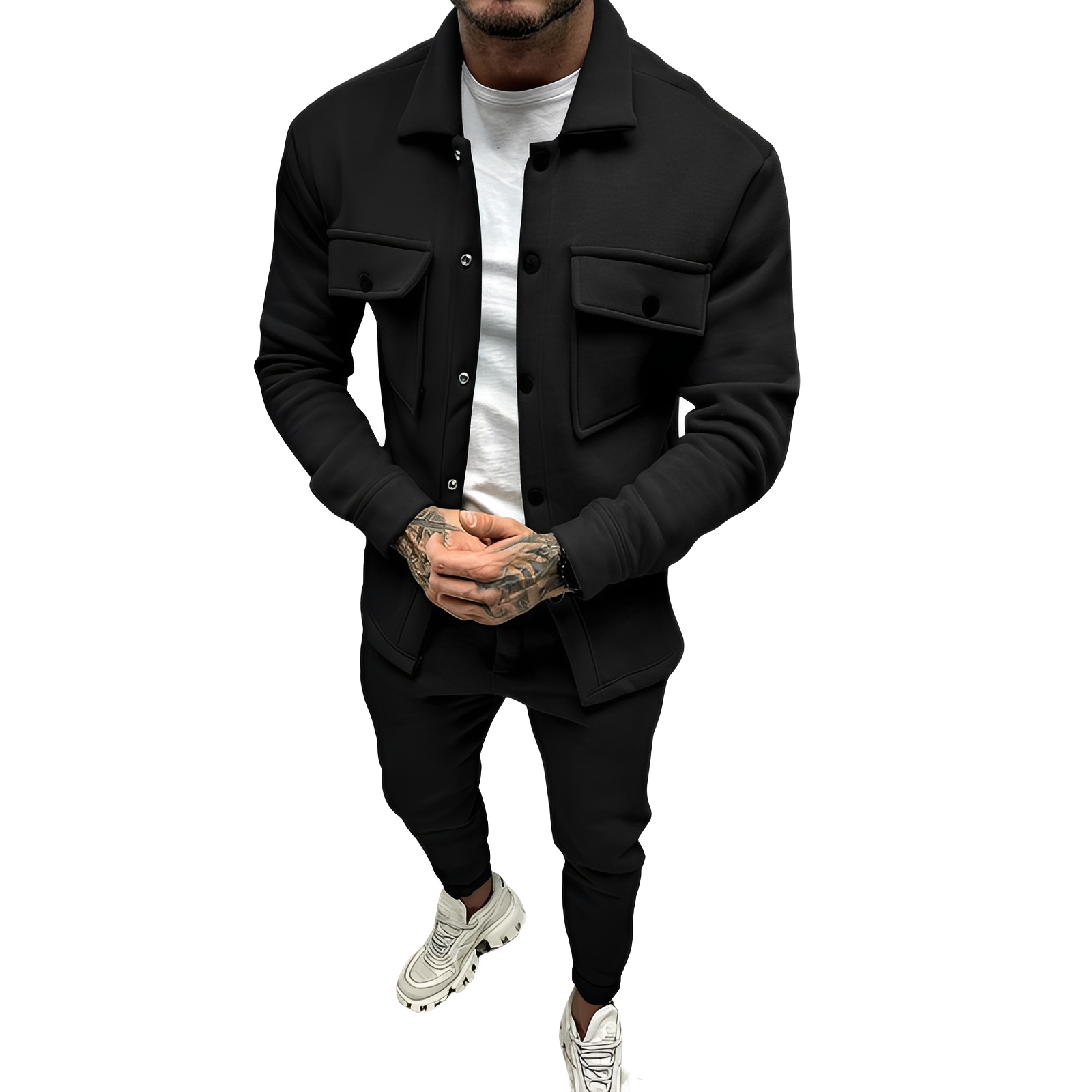 Tämä moderni slim-fit-setti vakuuttaa selkeällä, hienostuneella ilmeellään ja vartalonmyötäisellä istuvuudellaan. Pehmeä, joustava materiaali takaa miellyttävän käyttömukavuuden, kun taas moderni leikkaus korostaa hoikkaa, eleganttia siluettia. Takkiin ja yhteensopiviin housuihin yhdistettynä setti on monikäyttöinen – ihanteellinen vapaa-aikaan, matkustamiseen tai rentoihin tilaisuuksiin. Täydellinen miehille, jotka etsivät modernia, huoliteltua asua.