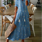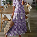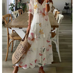 Löydä tämän tyylikkään boheemin pitkän mekon todellinen viehätys, joka on valmistettu pehmeästä ja hengittävästä kankaasta, joka takaa optimaalisen mukavuuden koko päivän ajan. Sen romanttinen V-kaula-aukko ja sulava siluetti antavat sille naisellisen ja vapaan ilmeen, joka sopii täydellisesti rentoihin ulkoiluihin ja erityisiin tilaisuuksiin. Sen kevyt laskostus ja kevyt rakenne korostavat kaikkia vartalotyyppejä. Sen rento mutta hienostunut tyyli tekee siitä ihanteellisen valinnan niille, jotka rakastavat boheemi chic -muotia ripauksella hienostuneisuutta. Yhdistä se sandaaleihin rentoa ilmettä varten tai pukeudu korkokenkiin ja asusteisiin iltaa varten.