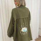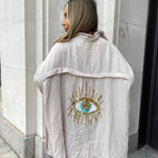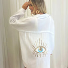 Tutustu kesätyylin huipentumaan Naisten Kimono Takki – Ylisuuri Leikkaus – Kevyt Harsokangas – Kirjailtu Silmä Design. Tämä kevyt ja väljä kimono, jossa on kirjailtu silmäkuvio selässä, tuo boheemin ja mystisen vivahteen mihin tahansa asuun.