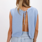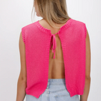 Tämä hihaton neule toppi yhdistää mukavuuden avoimeen selkään ja tyylikkääseen solmukiinnitykseen. Täydellinen rentoon tyyliin ripauksella eleganssia, ihanteellinen kerrospukeutumiseen ja lämpimiin päiviin. Mukava istuvuus tekee tästä vaatteesta vaatekaappisi välttämättömän.