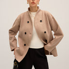 Rento katutyylinen – yli-iso takki ajankohtaisella nappikaulussuunnittelulla.