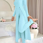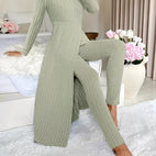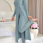 Tämä ribbikangas-setti yhdistää mukavuuden ja modernin muotoilun yhdeksi asuksi. Pehmeä materiaali tuntuu miellyttävältä iholla ja tarjoaa parhaan käyttömukavuuden. Settiin kuuluu yläosa ja yhteensopivat housut, jotka joustavan leikkauksensa ansiosta tarjoavat liikkumisvapautta. Olipa kyseessä rento päivä kotona, kävelyretki tai vapaa-ajan aktiviteetit – setti on monikäyttöinen ja samalla muodikas. Yksinkertaisen, elegantin muotoilunsa ansiosta se on helppo yhdistää muihin vaatteisiin.