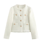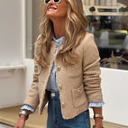 Tämä Murielin lyhyt tweed-takki naisille yhdistää ajattoman eleganssin ja rennon hienostuneisuuden. Suunniteltu tarjoamaan istuva ja imarteleva leikkaus, se sopii täydellisesti yhteen housujen, hameen tai farkkujen kanssa, työssä tai viikonlopun menoissa. Klassinen nappikiinnitys lisää hienostuneisuutta, kun taas teksturoitu tweed-kangas tuo syvyyttä ja tyyliä kaikkiin asuihisi. Kevyt mutta rakenteellinen, se takaa optimaalisen mukavuuden säilyttäen samalla tyylikkään siluetin. Monipuolinen vaate, joka on välttämätön naisille, jotka etsivät tyyliä, mukavuutta ja itsevarmuutta.
