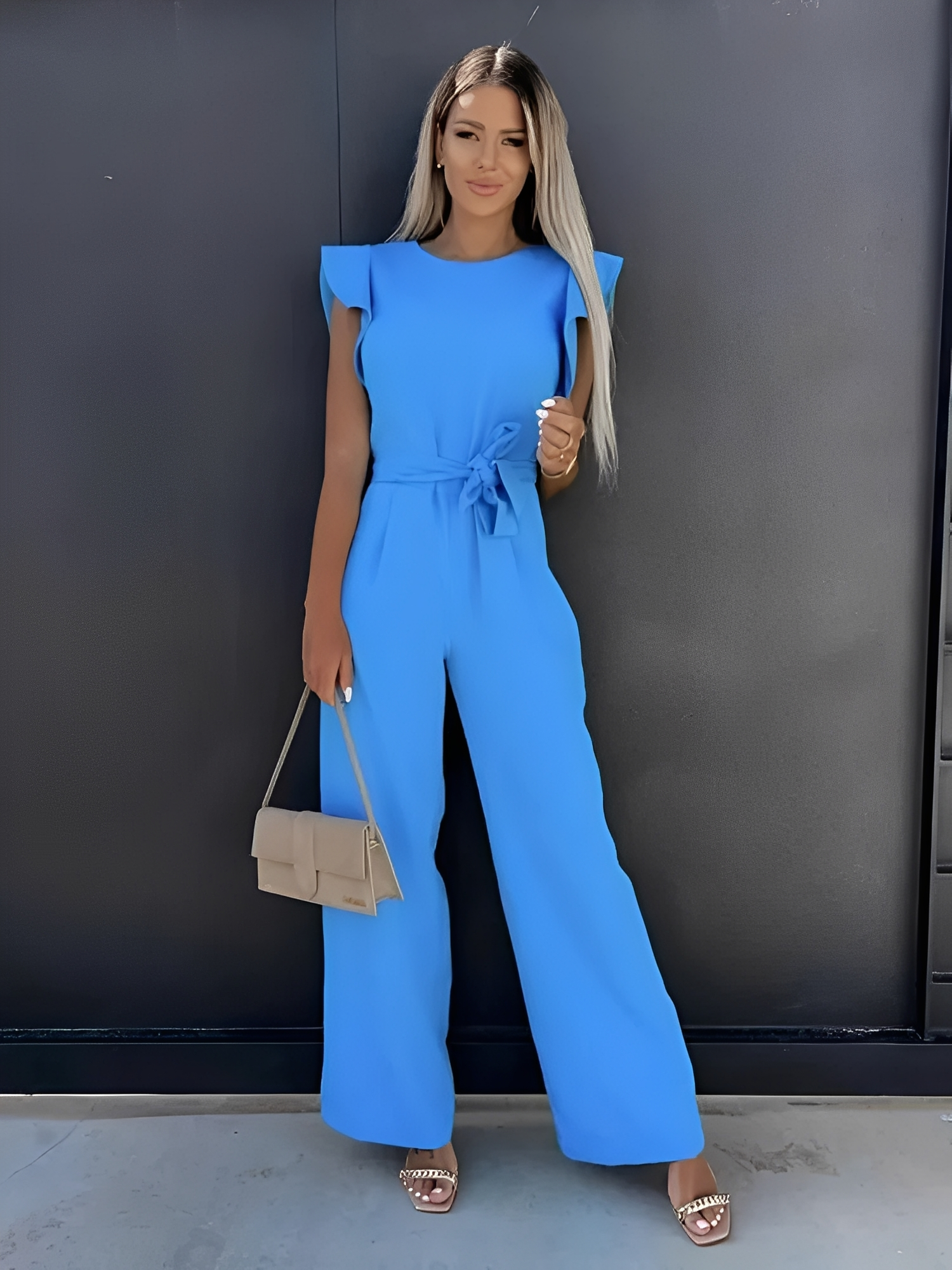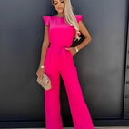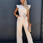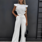 Nina haalarit yhdistävät yksinkertaisen eleganssin leikkisiin elementteihin – röyhelöhihat antavat naisellisen kosketuksen, kun taas vyötäröä korostava leikkaus istuu täydellisesti.