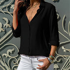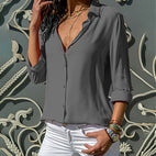 Naisten pitkähihainen paita on sekä tyylikäs että mukava pehmeän ja hengittävän kankaansa ansiosta, väljä leikkaus, kaulus, napit edessä ja pitkät hihat. Se korostaa viehättävää siluettiasi ja tunnet olosi upeaksi sitä käyttäessäsi, saaden paljon kehuja päivittäisestä asustasi.