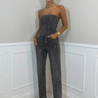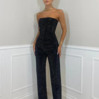 Tämä olkaimeton haalari yhdistää hienostuneisuuden ja glamourin tyylikkäässä muotoilussa. Kiiltävä materiaali kiinnittää huomion, kun taas istuva leikkaus luo imartelevan siluetin. Ihanteellinen juhliin, iltatapahtumiin tai erityistilaisuuksiin, joissa haluat erottua.