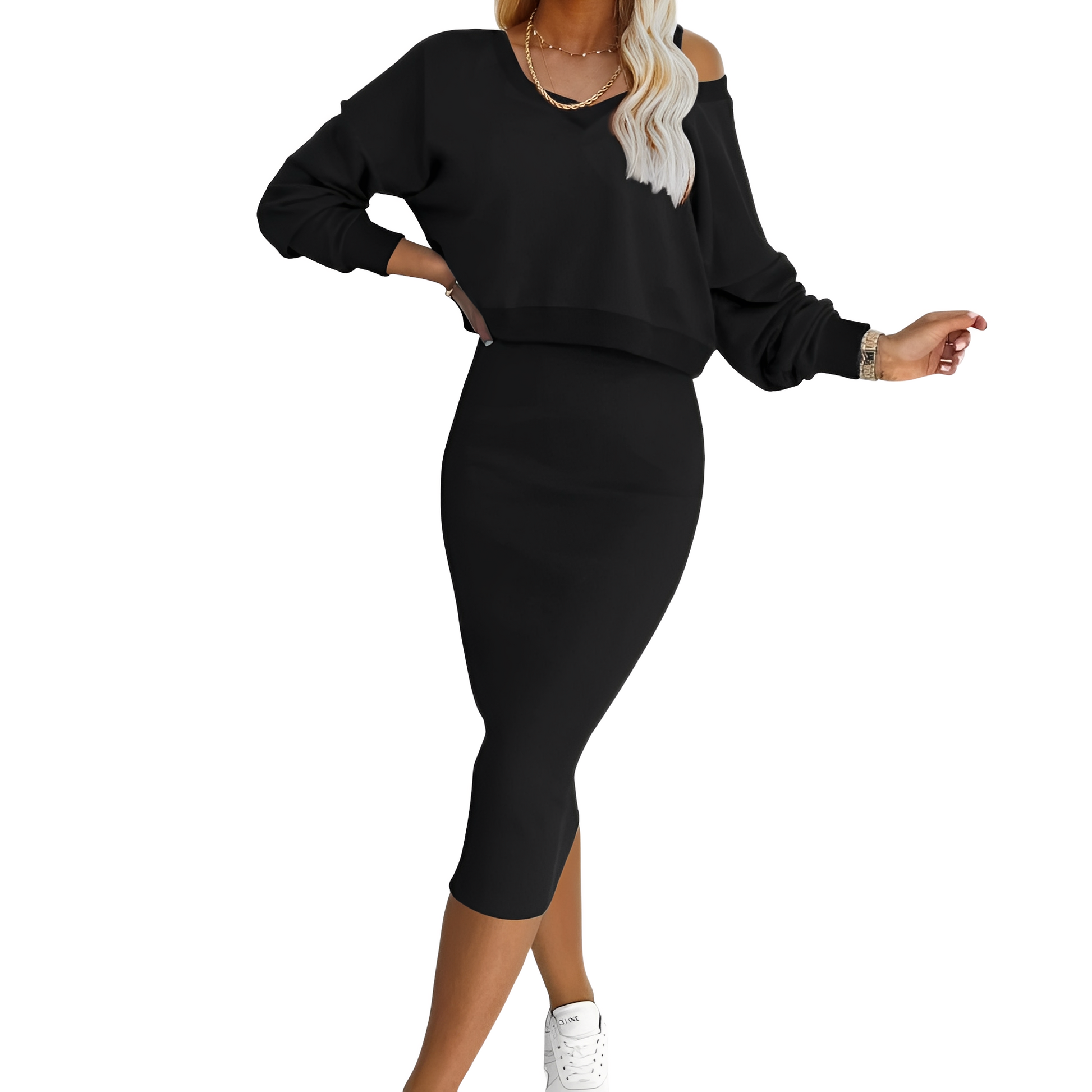 Naisellinen V-pääntie ja yhteensopiva hame yhtenäiseen asuun