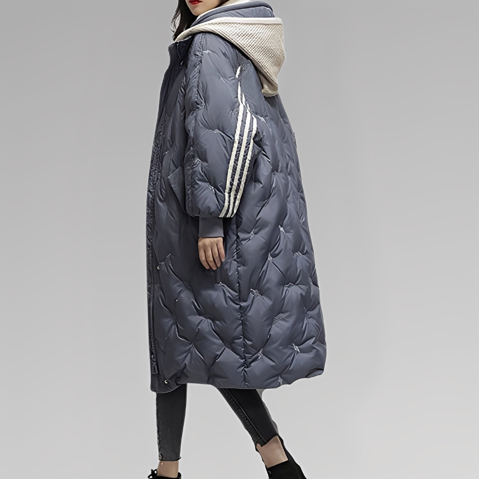 Pitkä naisten toppatakki hupulla ja ajanmukaisella istuvuudella